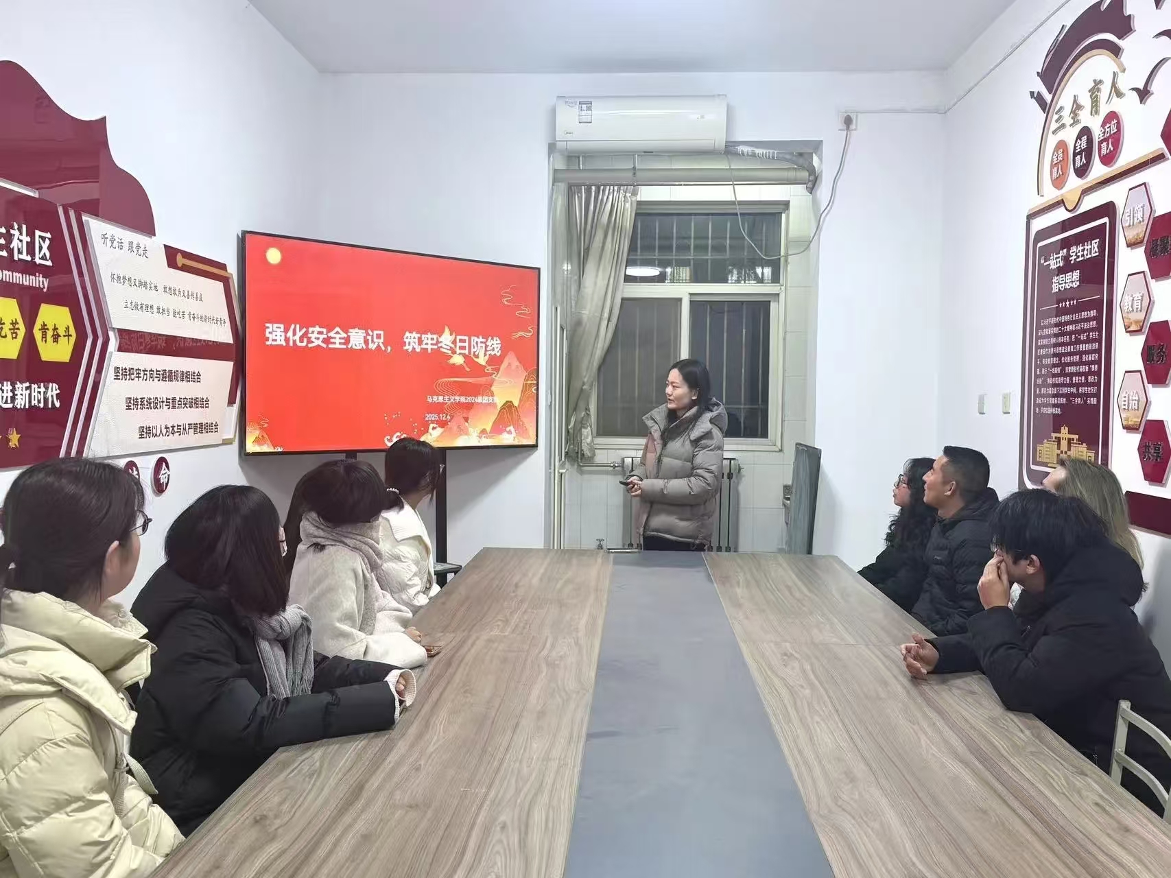 团支部于11号公寓“一站式”学生社区开展“强化安全意识,筑牢冬日防线”主题团日活动。本次活动由2024级团支书张睿怡主讲,全体共青团员参与。
